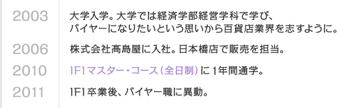 日本橋店で販売を担当していた入社3年目の時、会社の能力開発制度でIFIのマスター・コース(全日制)の企業派遣の公募が出ているのを知り応募。1年間、現場を離れ、IFIに通わせて頂くこととなりました。